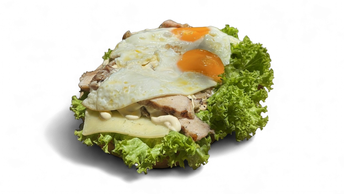 Αφράτο ψωμί βουτύρου (20cm) με χοιρινή μπριζόλα μαριναρισμένη και ψημένη στο giil με Π.Ο.Π. γραβιέρα, μανιτάρια φρέσκα Πηλίου, μαγιονέζα με τρούφα, 2 αυγά τηγανητά και πράσινη σαλάτα