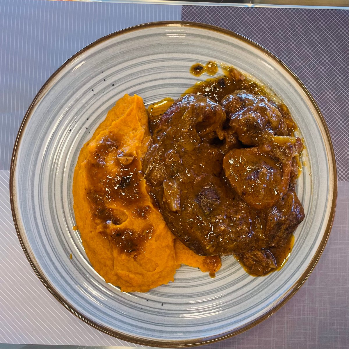 Τρυφερό μοσχαράκι κατσαρόλας με δαμάσκηνα και πορτοκάλι. Συνοδεύεται από γαρνιτούρα της επιλογής σου