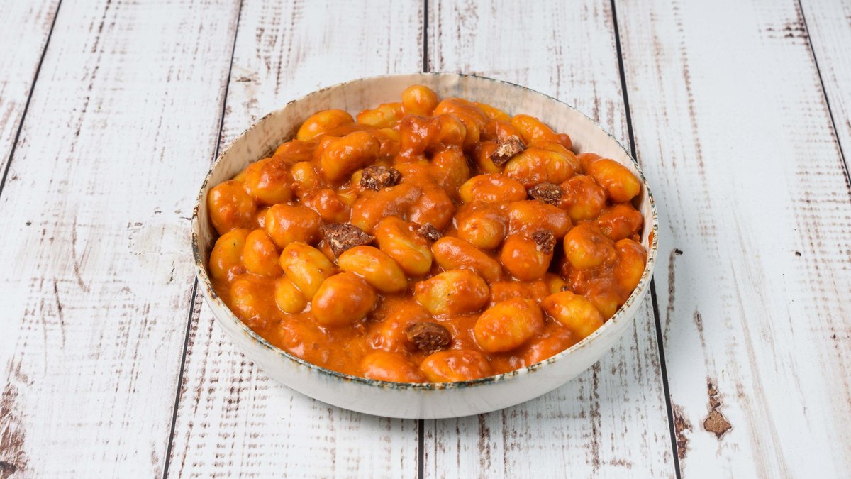 Φρέσκα νιόκι πατάτας με σάλτσα ντομάτας και έξτρα πικάντικο σουτζούκι Αδάνων (καυτερό)