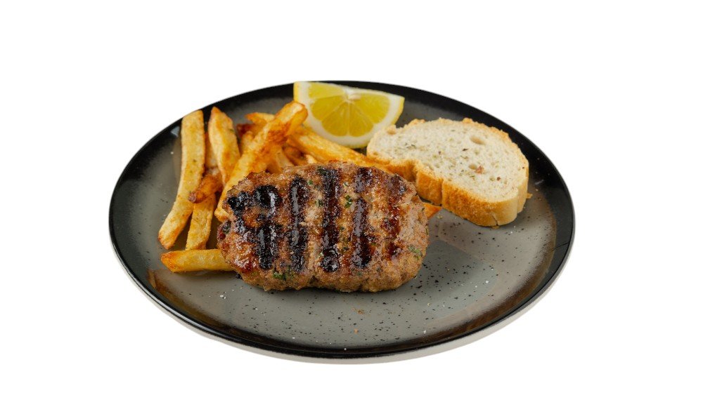 Μπιφτέκι από 100 % μοσχαρίσιο κιμά, φρέσκες τηγανητές πατάτες και αρωματικό dip γιαουρτιού