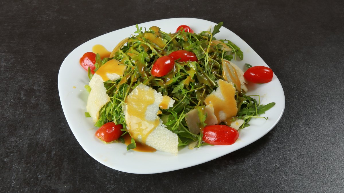 Σαλάτα με ρόκα, μαρούλι, παρμεζάνα, ντοματίνια και σως βαλσάμικο