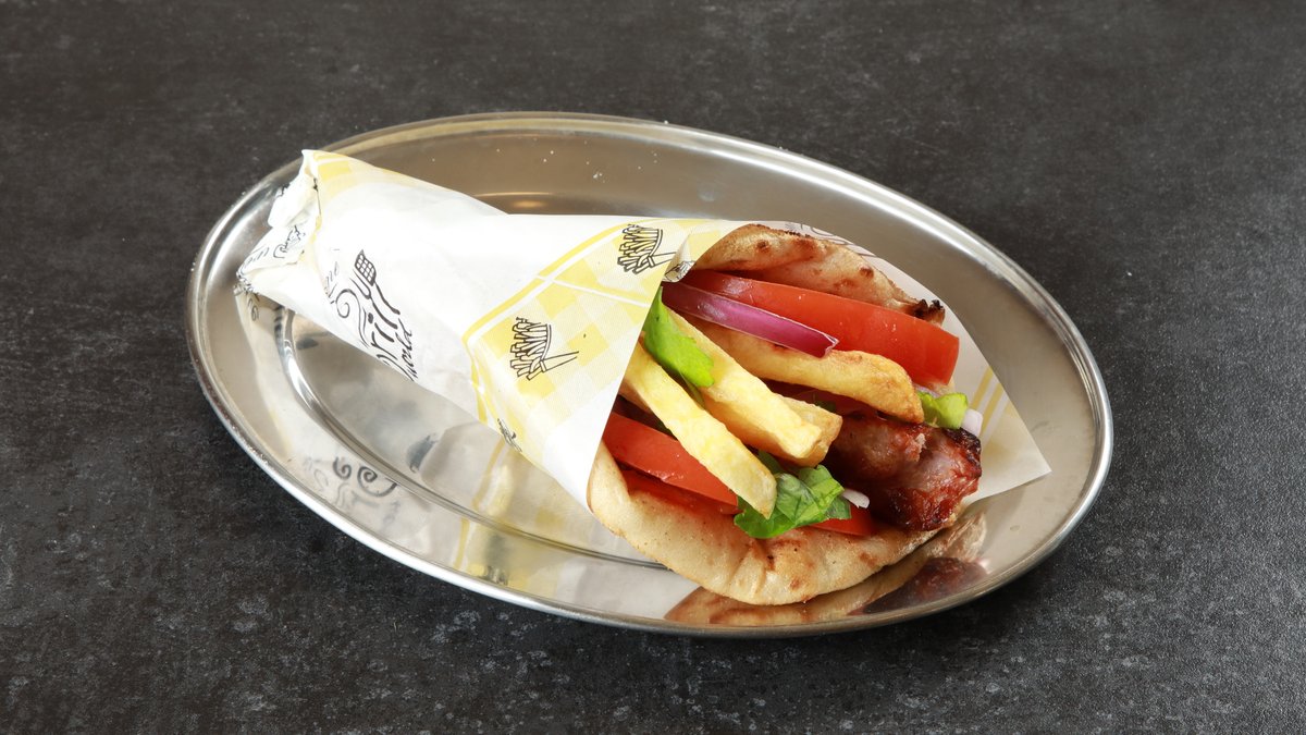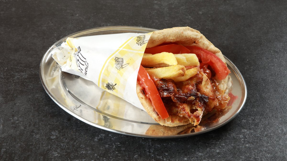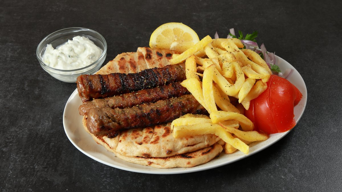 Σκεπαστή πολίτικο κεμπάπ με τα υλικά της επιλογής σου. Συνοδεύεται από πατάτες τηγανητές