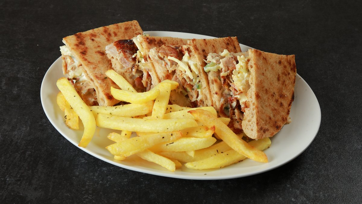 Συνοδεύεται από πατάτες τηγανητές, ντομάτα, κρεμμύδι, 2 πίτες και σως της επιλογής σου