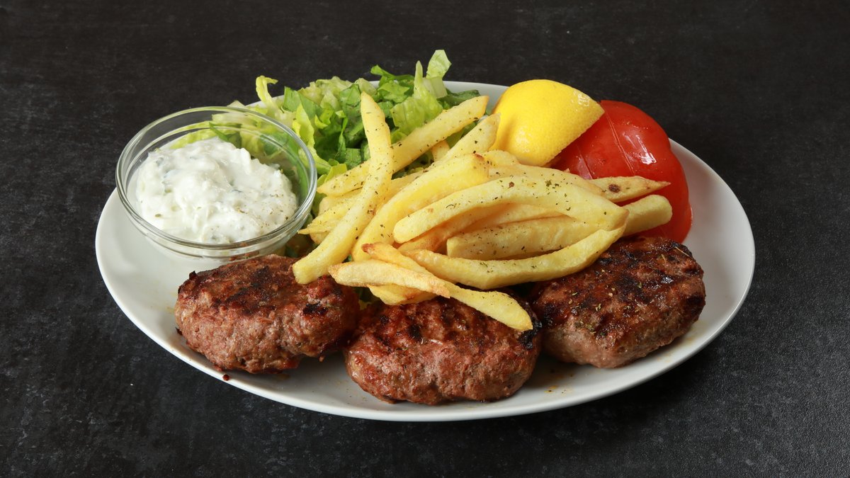 3 Τεμάχια. Χειροποίητα. Συνοδεύεται απο πατάτες τηγανητές, ντομάτα, μαρούλι και τζατζίκι