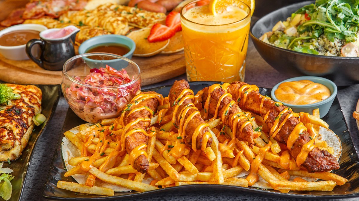 Για 2 άτομα. Με 4 french toasts, λουκάκνικα cocktail, μπέικον, rolls ομελέτας, 6 mini pancakes, 1 dip μελιού και 1 dip πραλίνας σοκολάτας