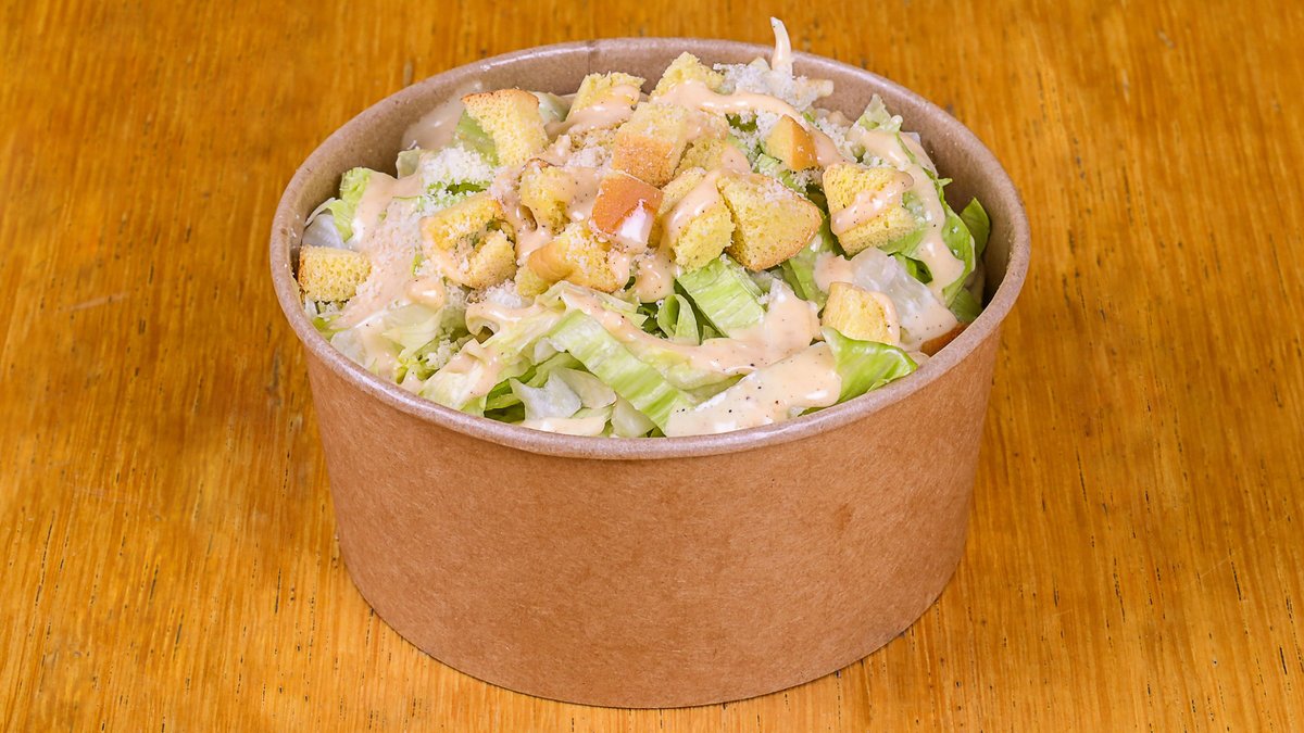 Φρεσκοκομμένο τραγανό αϊσμπέργκ, νιφάδες τριμμένης παρμεζάνας, κρουτόνς και σάλτσα καίσαρα