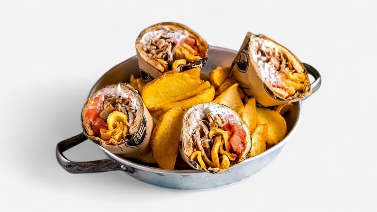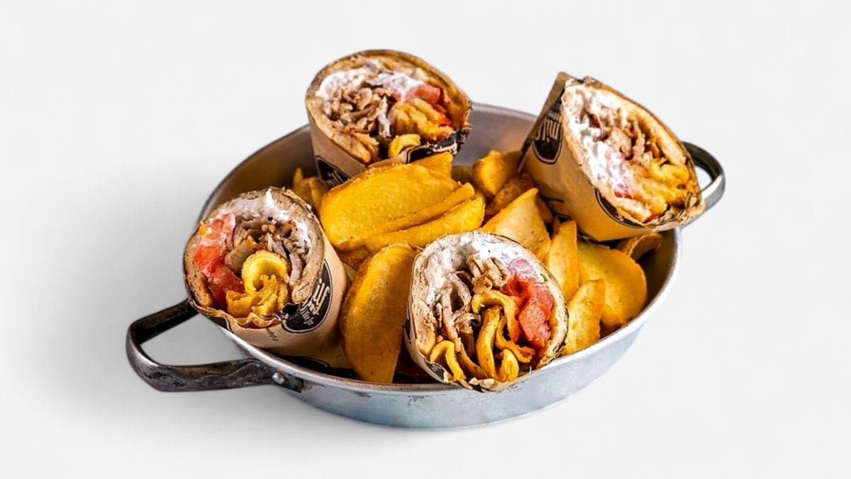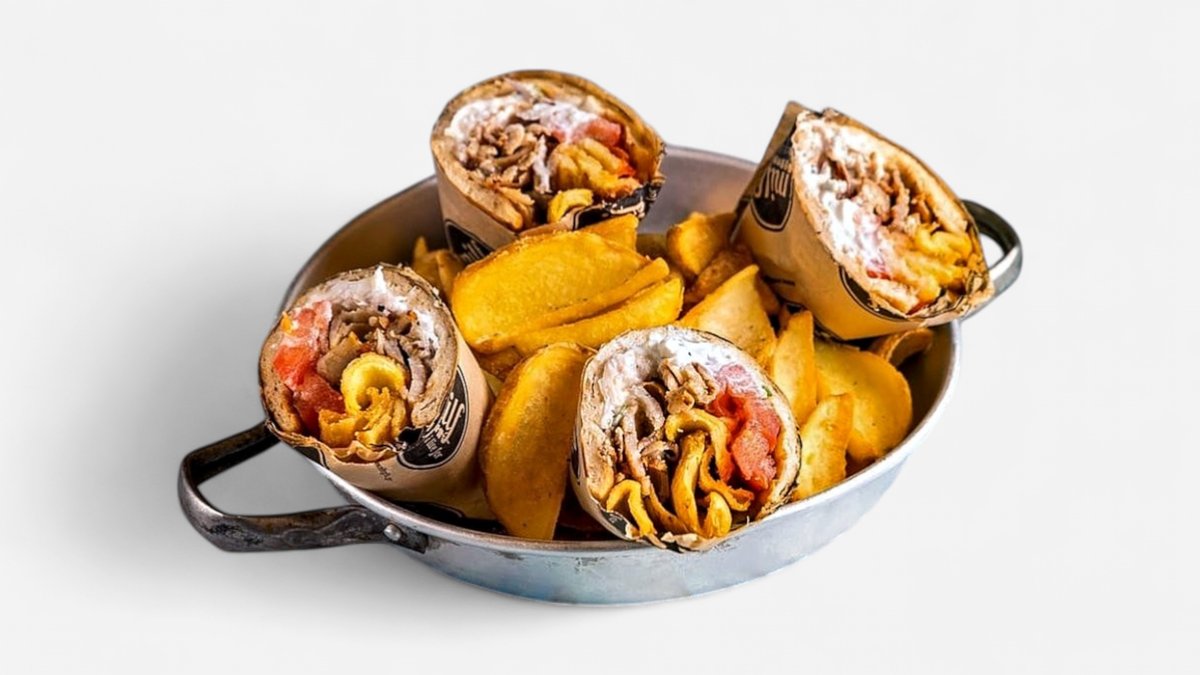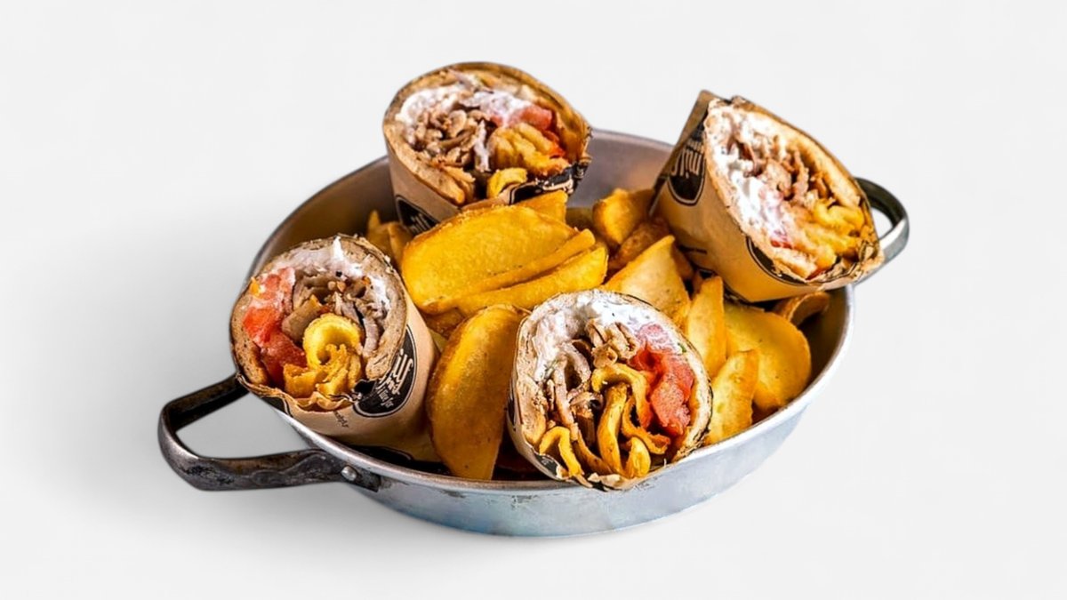 Συνοδεύεται από πίτα, πατάτες τηγανητές, πολίτικη σαλάτα και τζατζίκι