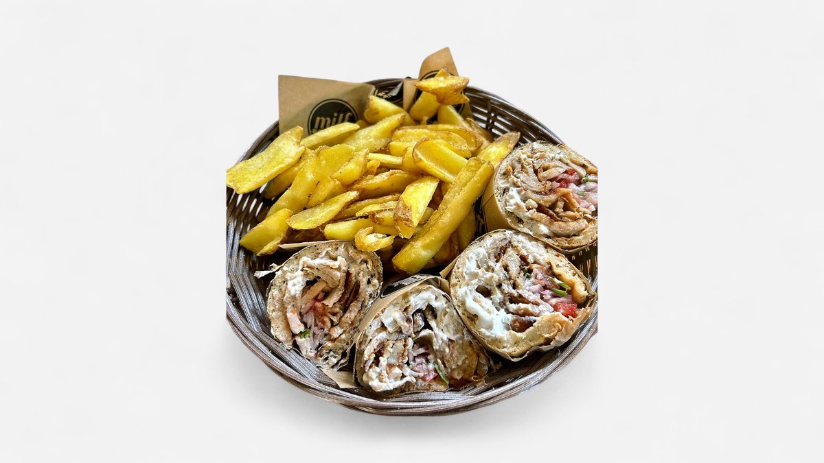 4 mini τυλιχτά με μπιφτέκι λαχανικών, ντομάτα, πατάτα, μαρούλι και μαγιονέζα. Συνοδεύεται από πατάτες τηγανητές