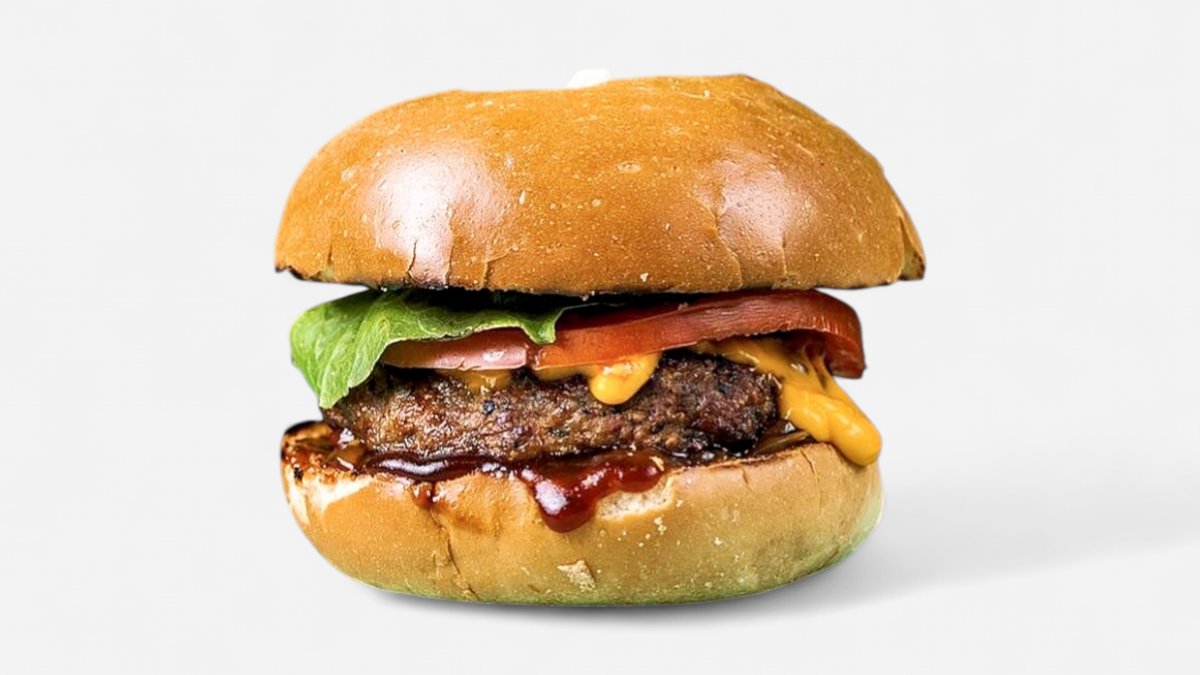 Με μπιφτέκι, μπέικον, cheddar, ντομάτα, καραμελωμένο κρεμμύδι και BBQ sauce