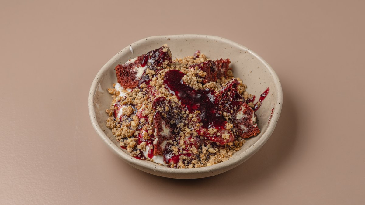 Yogurt bowl raspberry jam & red velvet cupcake 🧁