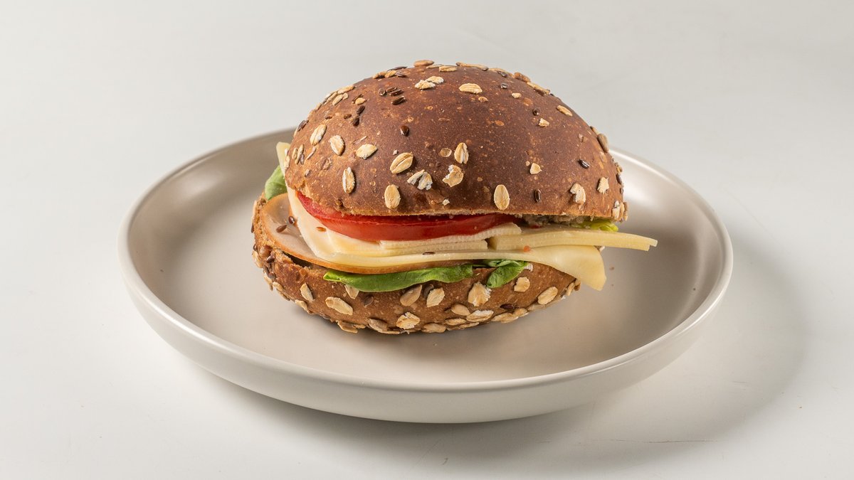 Ψωμί ολικής άλεσης αργής ωρίμασης με προζύμι, γεμιστό με κοτόπουλο φιλέτο στήθος, iceberg, guacamole avocado και κρέμα γιαούρτι