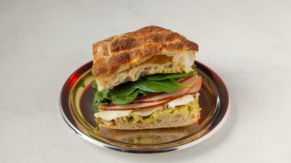Αφράτη ζύμη ελαιόλαδου με σιμιγδάλι, καπνιστή γαλοπούλα, σάλτσα πέστο, μοτσαρέλα και λιαστή ντομάτα