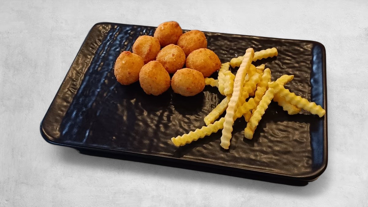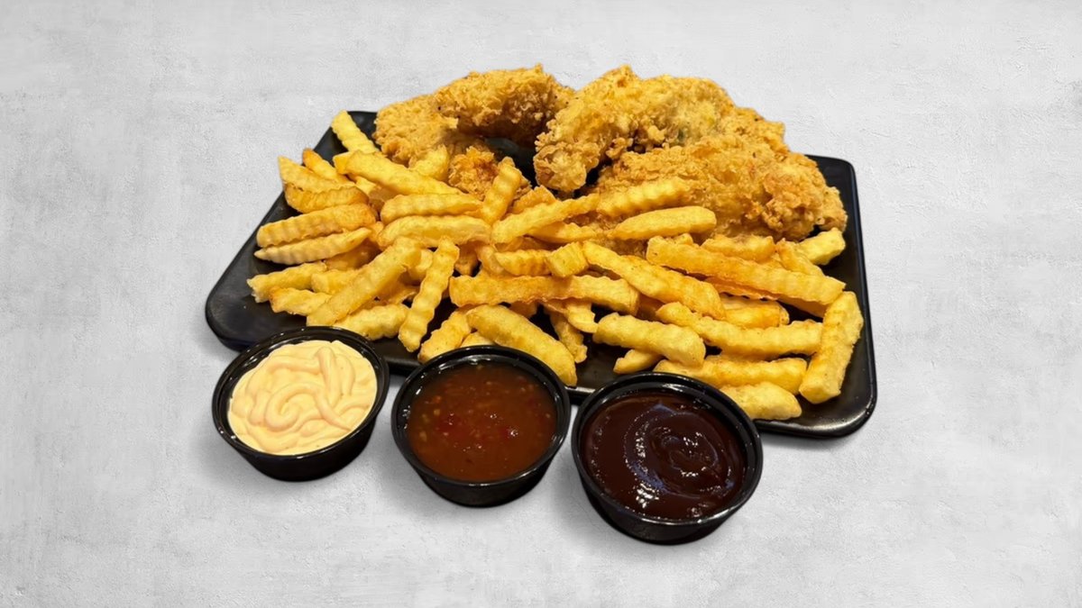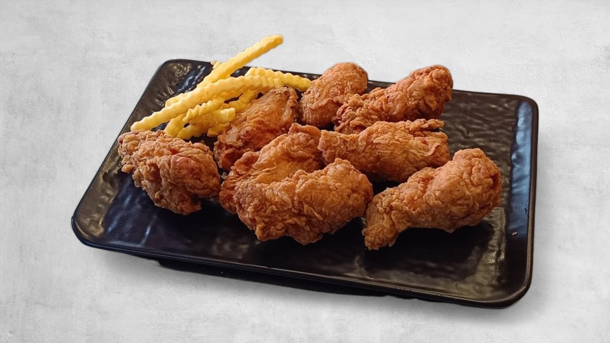 3 φτερούγες,3 κοτομπουκιές. Συνοδεύεται από πατάτες τηγανητές crinkle