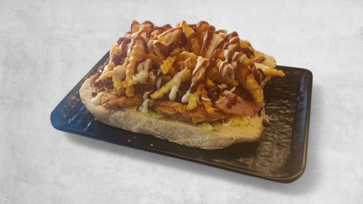 Αφράτο ψωμάκι sandwich, 100% φιλέτα κοτόπουλο πάνε, iceberg, cheddar, bacon, καραμελωμένο κρεμμύδι, πατάτες, μαγιονέζα, bbq