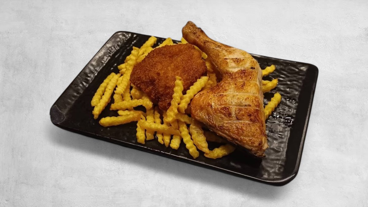 Με 1 μπούτι ολόκληρο ψητό, 1 φιλέτο κοτόπουλο πανέ, πατάτες τηγανητές & sauce της επιλογής σας