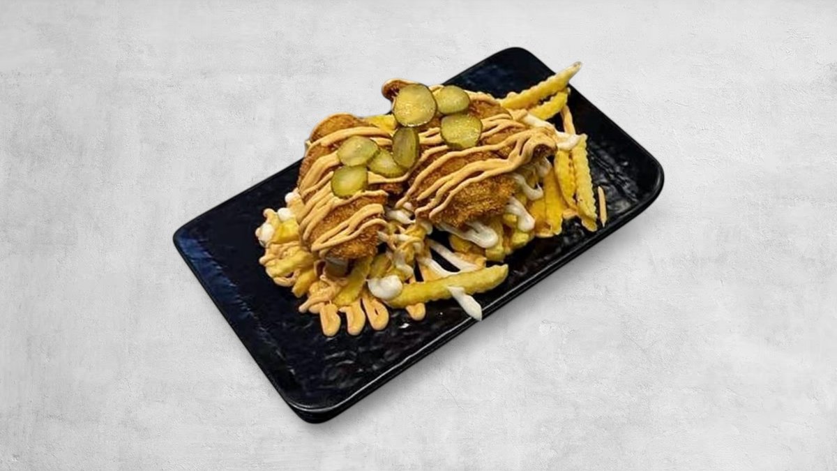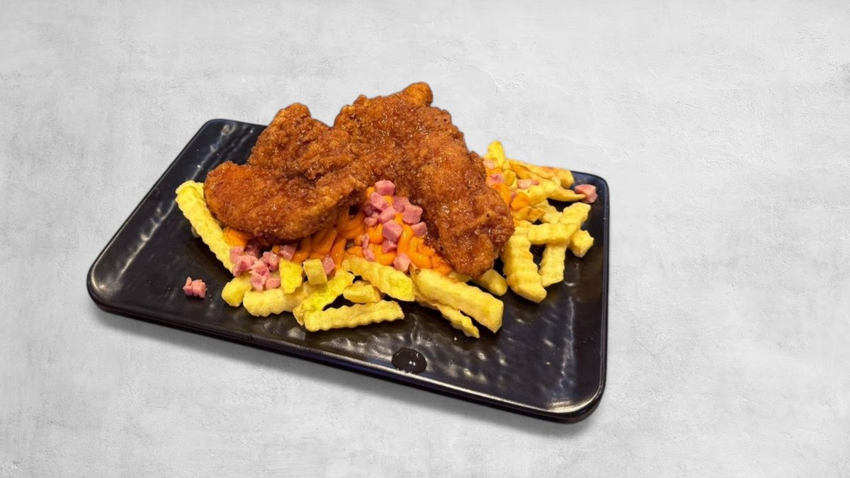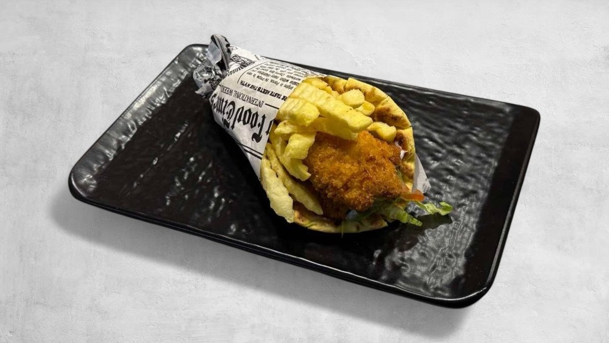 Με 2 φιλέτα κοτόπουλο πανέ, πατάτες τηγανητές, πίκλες μαγιονέζα & french dressing