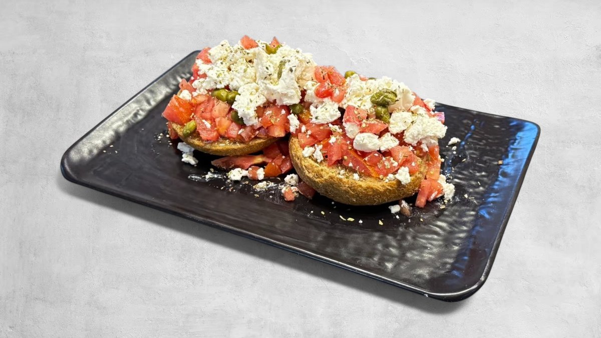 Κρητικό παξιμάδι, ντομάτα, κάπαρη, ξινομυζήθρα, ελαιόλαδο, ρίγανη