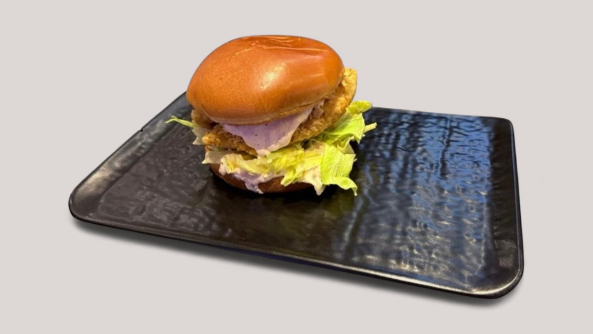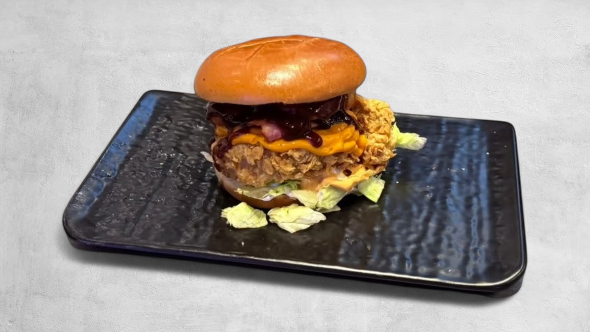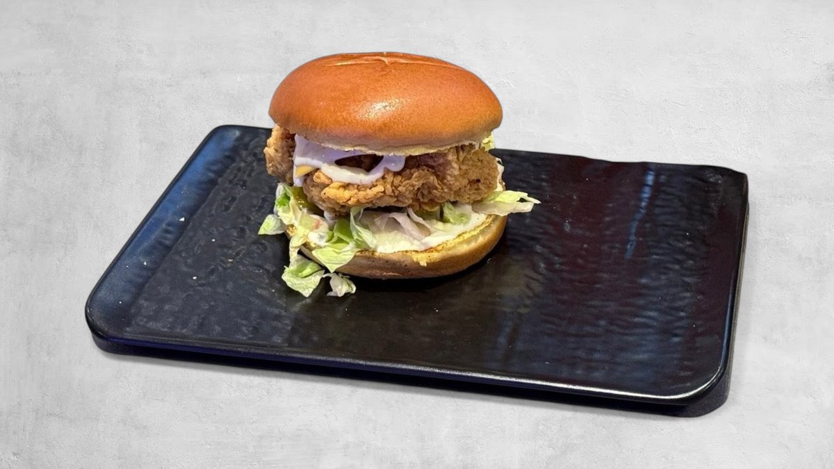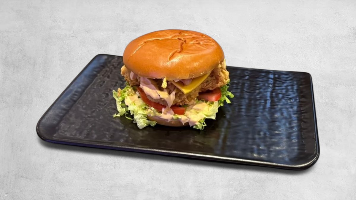 Επιλογή Ψωμάκι, 100% φιλέτο κοτόπουλο πανέ double, cheddar, κρεμμύδι, iceberg, hot mayo, jalapeno