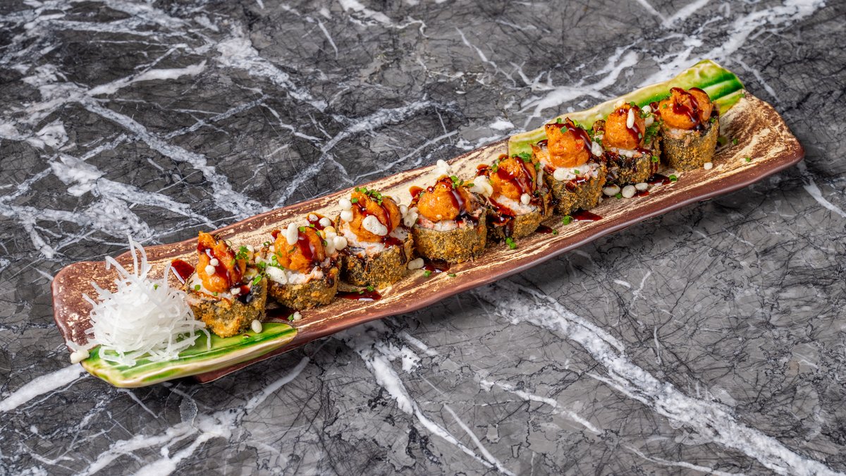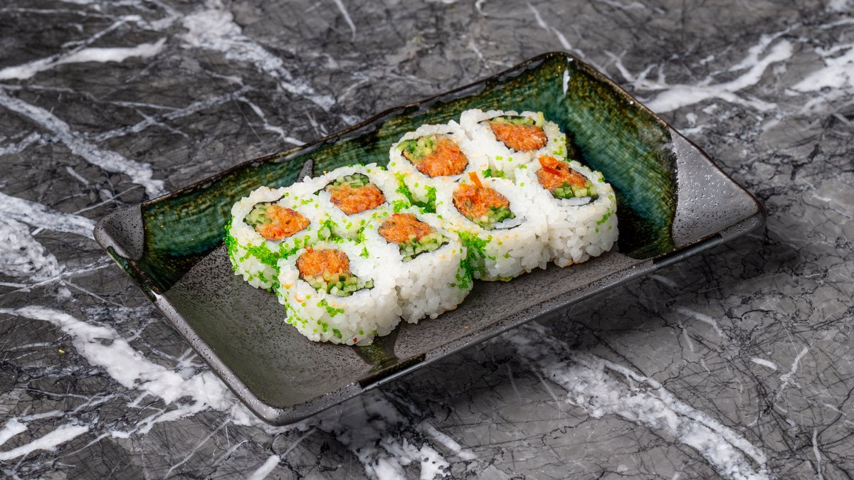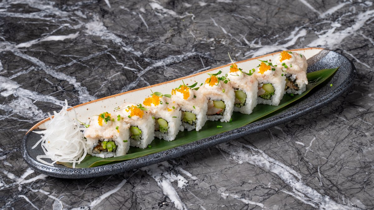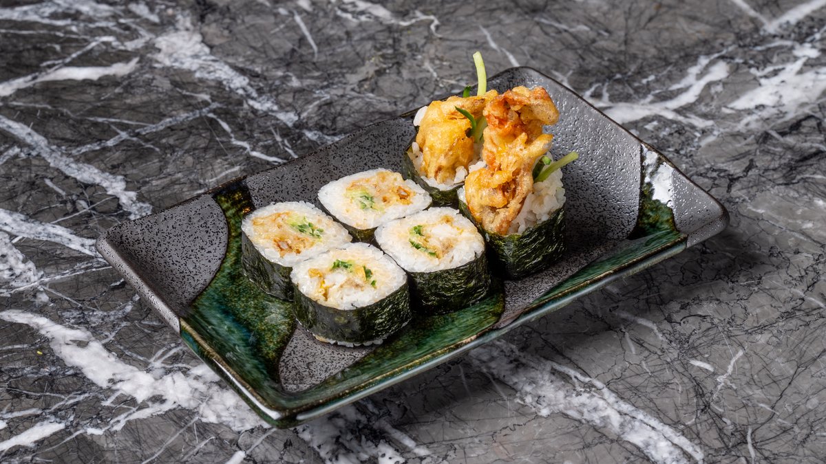 Με γαρίδα tempura, αγγούρι, τυρί κρέμα, chili mayo, tenkasu και tajin