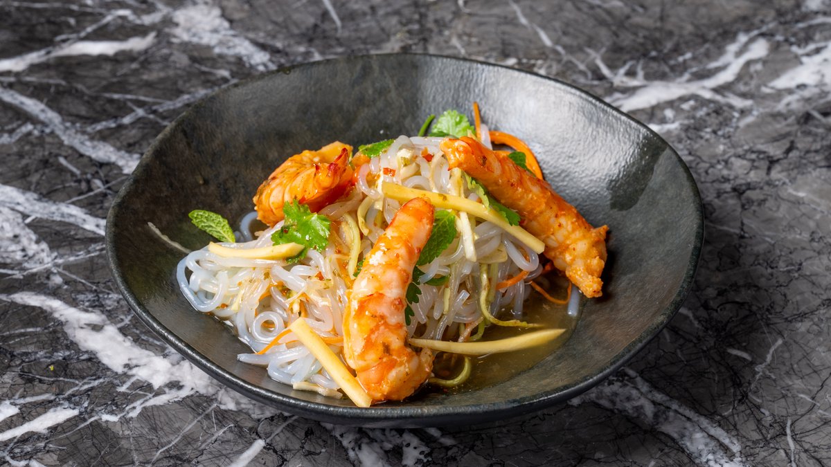 Με γαρίδες, shirataki noodles, μάνγκο, κόλιανδρο, δυόσμο και κάσιους