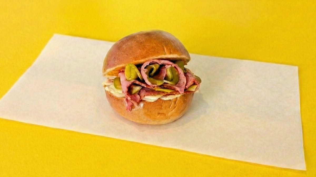 Ψωμάκι Brioche, παστράμι, flakes παρμεζάνας, πίκλα αγγούρι, chutney δαμάσκηνο-πιπεριά