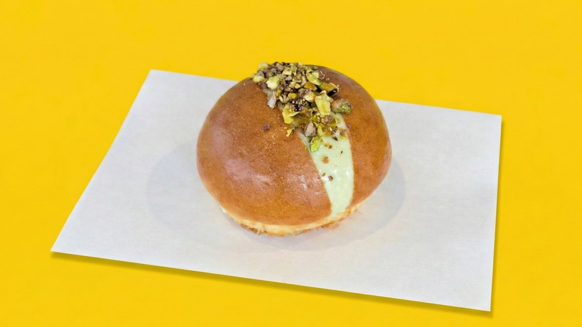 Χειροποίητο Brioche με γέμιση κρέμας βανίλια με μαστίχα, φύλλο καταϊφι και καραμελωμένο crumble φυστικιού αιγίνης