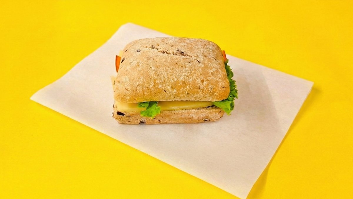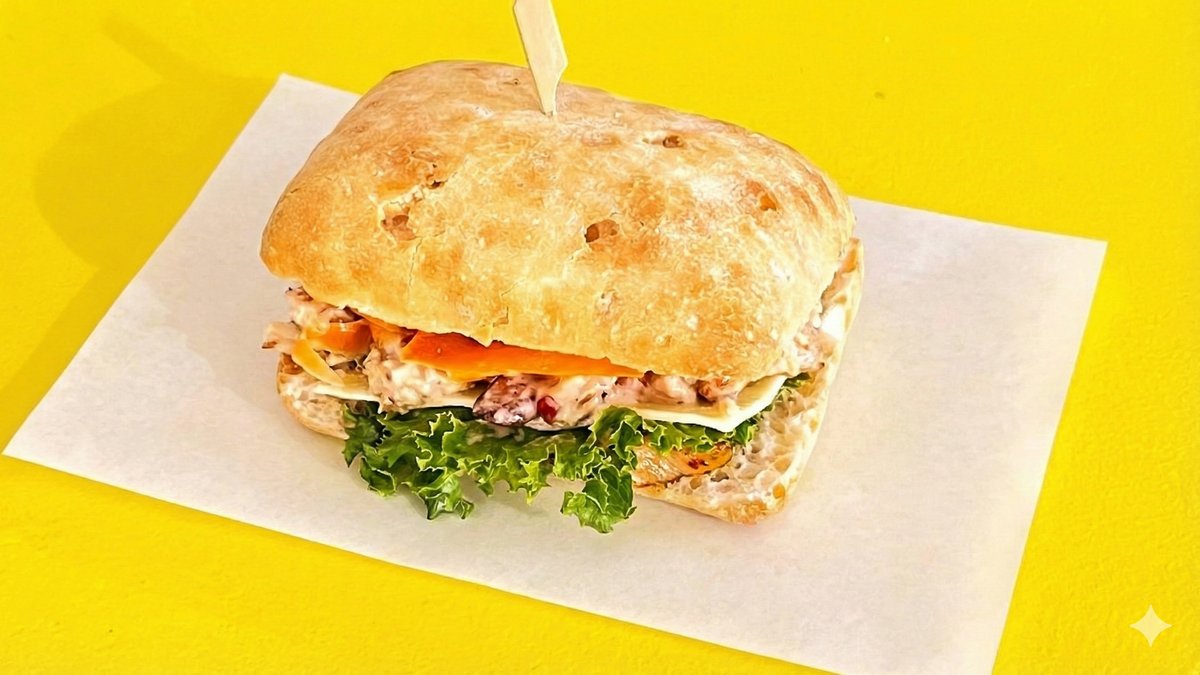 Τραγανό Bun με πίκλες καρότου, κοτοσαλάτα με sweet chilli, λόλα και τυρί Gooda