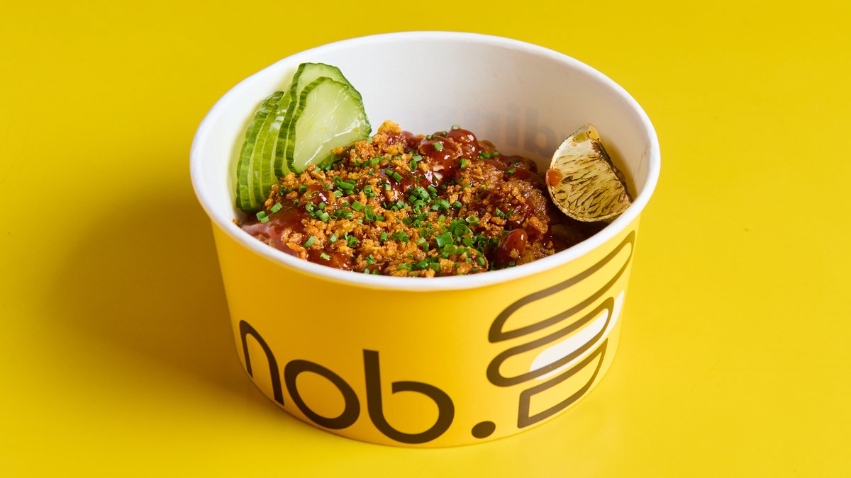 Με σιρόπι σόγιας σιγομαγειρεμένο, τυρί fontina, ραγού κρεμμυδιού, πίκλα αγγουριού και πικάντικη μαγιονέζα