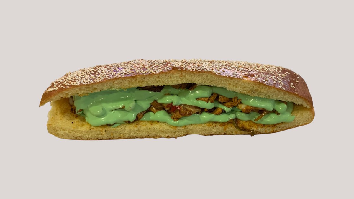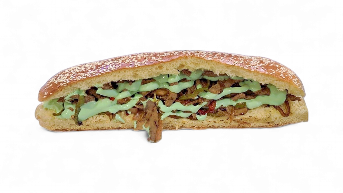 Φιλετο κοτοπουλο, πρασινη και κοκκινη πιπερια, κρεμμυδι, μανιταρια, καλαμποκι, cream toum,τυρι γκουντα, καυτερο