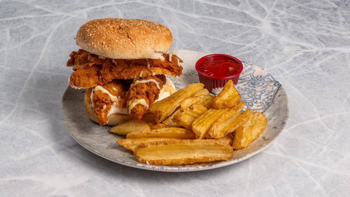 Παναρισμενο κοτοπουλο, cream toum, πατατες τηγανιτες