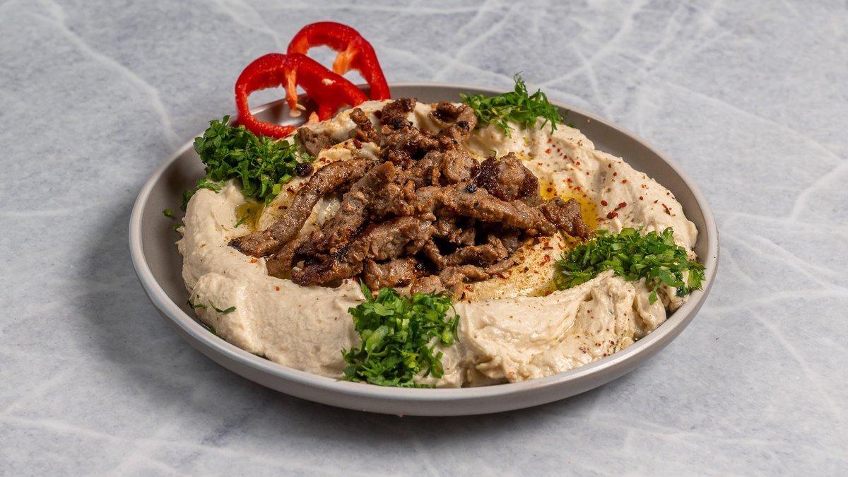 Steak, χουμους, ντοματα, μαϊντανος, τουρσι, κρεμμυδι, ταχινι, σος ροδιου