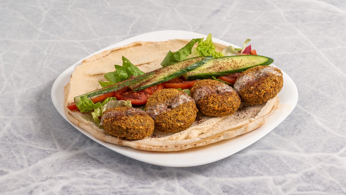 Φαλάφελ, ντομάτα, αγγούρι, μαρούλι, τουρσιά, σάλτσα ταχίνι, μελάσα ροδιού