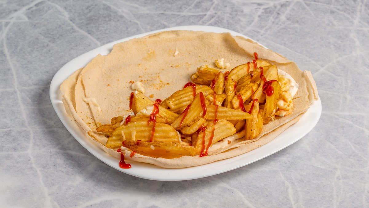 Τυλιχτο με μοσχάρι, σαουάρμα, κομμένο σε κομμάτια, χούμους, λαχανικά και πατάτες τηγανητές