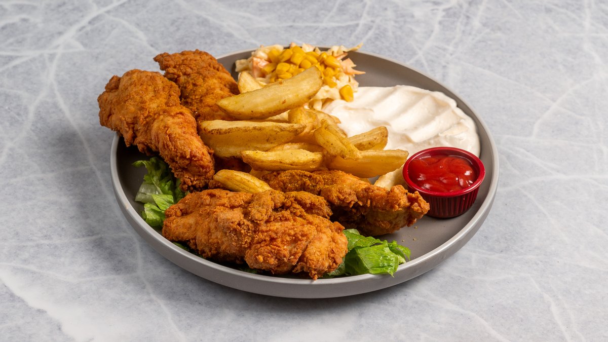 4 τεμ. Παναρισμενο κοτοπουλο, πατατες, cream toum, λαχανο-καροτο, κετσαπ