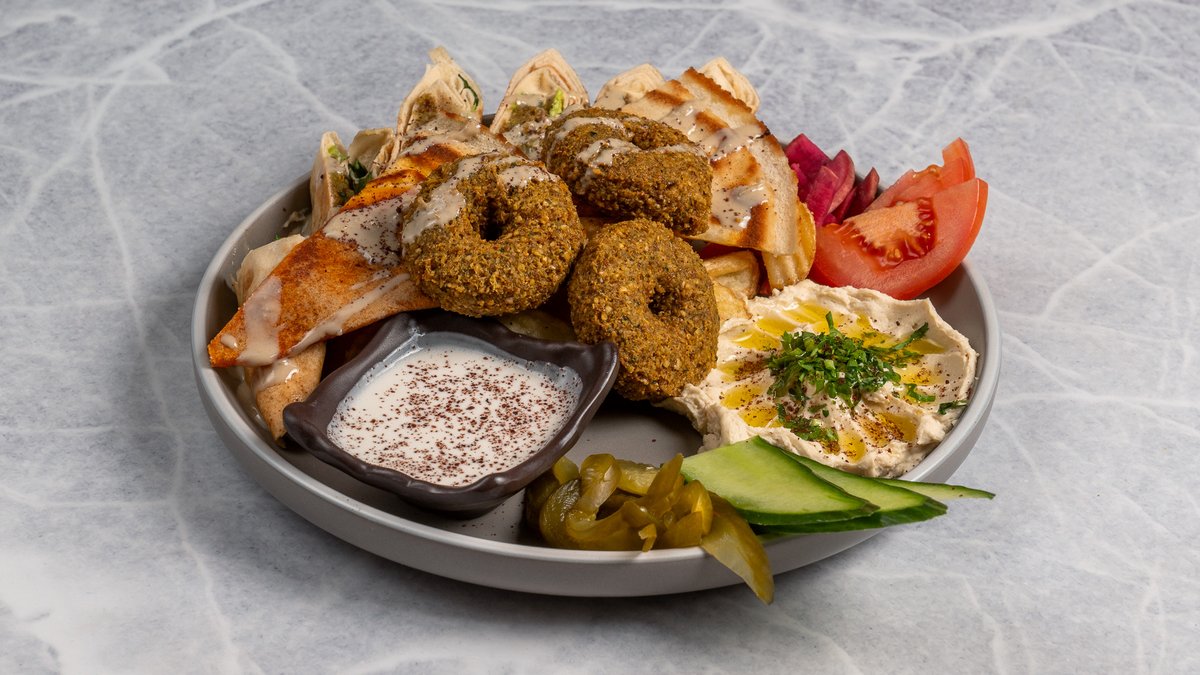 Φαλαφελ, χουμους, μαρουλι, ντοματα, αγγουρι, τουρσι, μεντα, σως γιαουρτιου