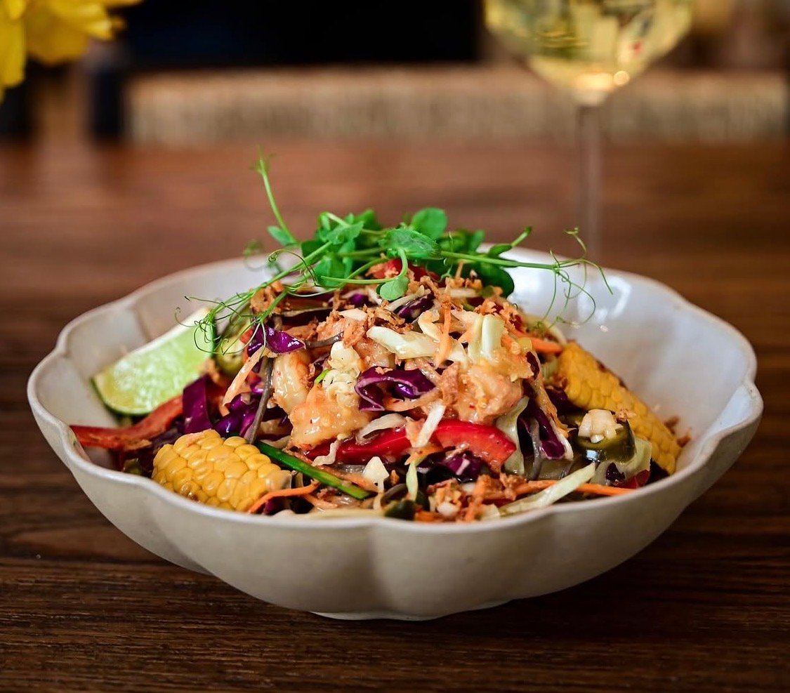 Shrimps noodles salad. Vegan Shrimps, buckwheat noodles, red sweet peppers, carrots, fresh onions, fried onions, red and white cabbage, jalapeño, corn, chive, pineapple and peanut-butter vinaigrette Νηστίσιμη σαλάτα γαρίδες, νουνλτς φαγόπυρου, κόκκινη πιπεριά, καρότο, φρέσκο κρεμμυδάκι, τηγανητό κρεμμυδάκι, κόκκινο και λευκό λάχανο, jalapenos, καλαμπόκι, σχοινόπρασο, βινεγκρέτ ανανά με φιστικοβούτυρο. *frozen shrimps | κατεψυγμένες γαρίδες