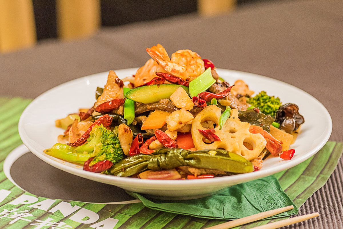 Πικάντικο κοτόπουλο με λαχανικά και φιστίκια. Συνοδεύεται από τηγανητό ρύζι με αυγό και Coca-Cola
