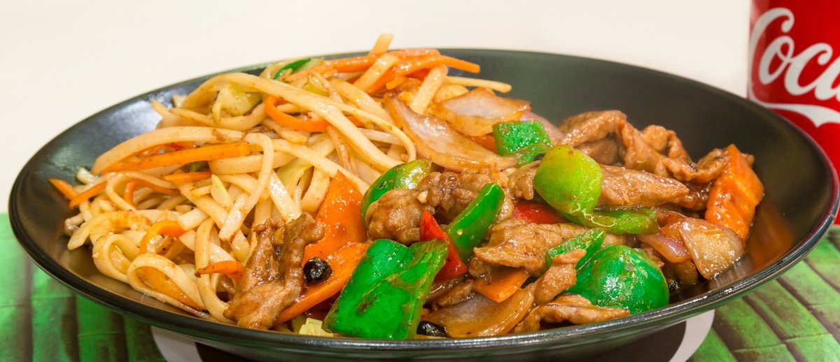 Μοσχάρι με λαχανικά με σάλτσα μαύρων φασολιών. Συνοδευεται με νουντλς με λαχανικά και Coca-Cola