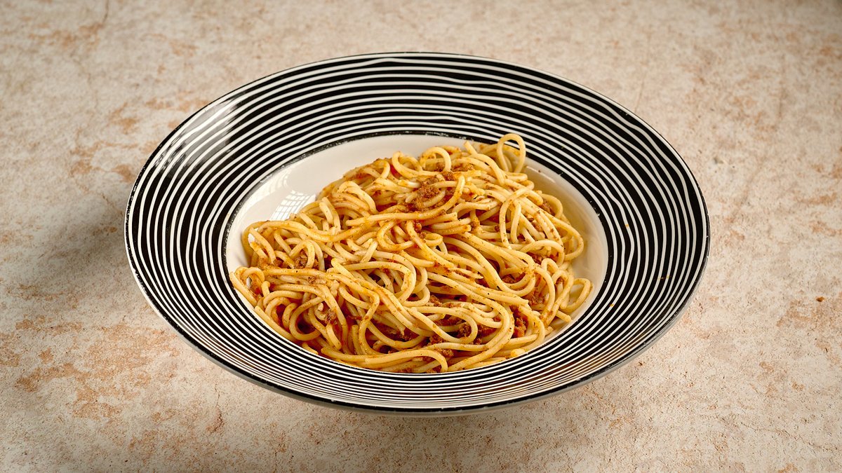 Με πλούσια σάλτσα ντομάτα και μοσχαρίσιο κιμά. Συνοδεύεται από κεφαλοτύρι τριμμένο