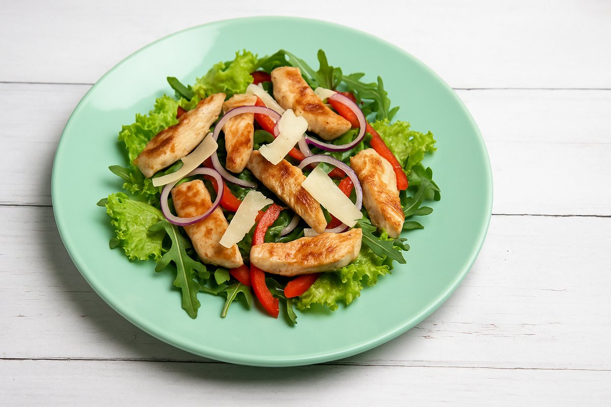 Λόλα, ρόκα, κρεμμύδι, πιπεριές, κοτόπουλο, παρμεζάνα, σως βινεγκρέτ.