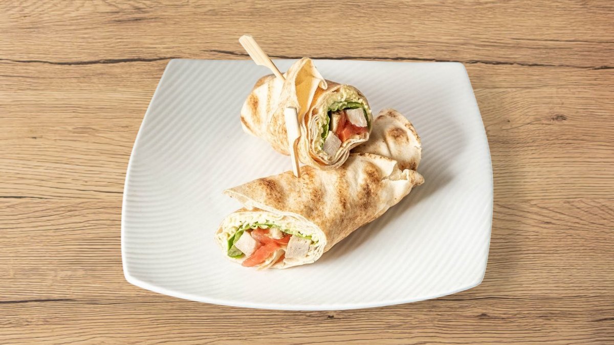 Με κοτόπουλο, gouda, ντομάτα, μαρούλι και μαγιονέζα. Συνοδεύεται από πατάτες τηγανητές