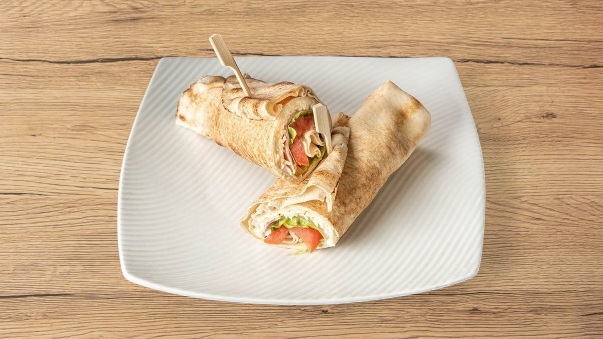 Με γαλοπούλα, gouda, ντομάτα, μαρούλι και μαγιονέζα. Συνοδεύεται από πατάτες τηγανητές