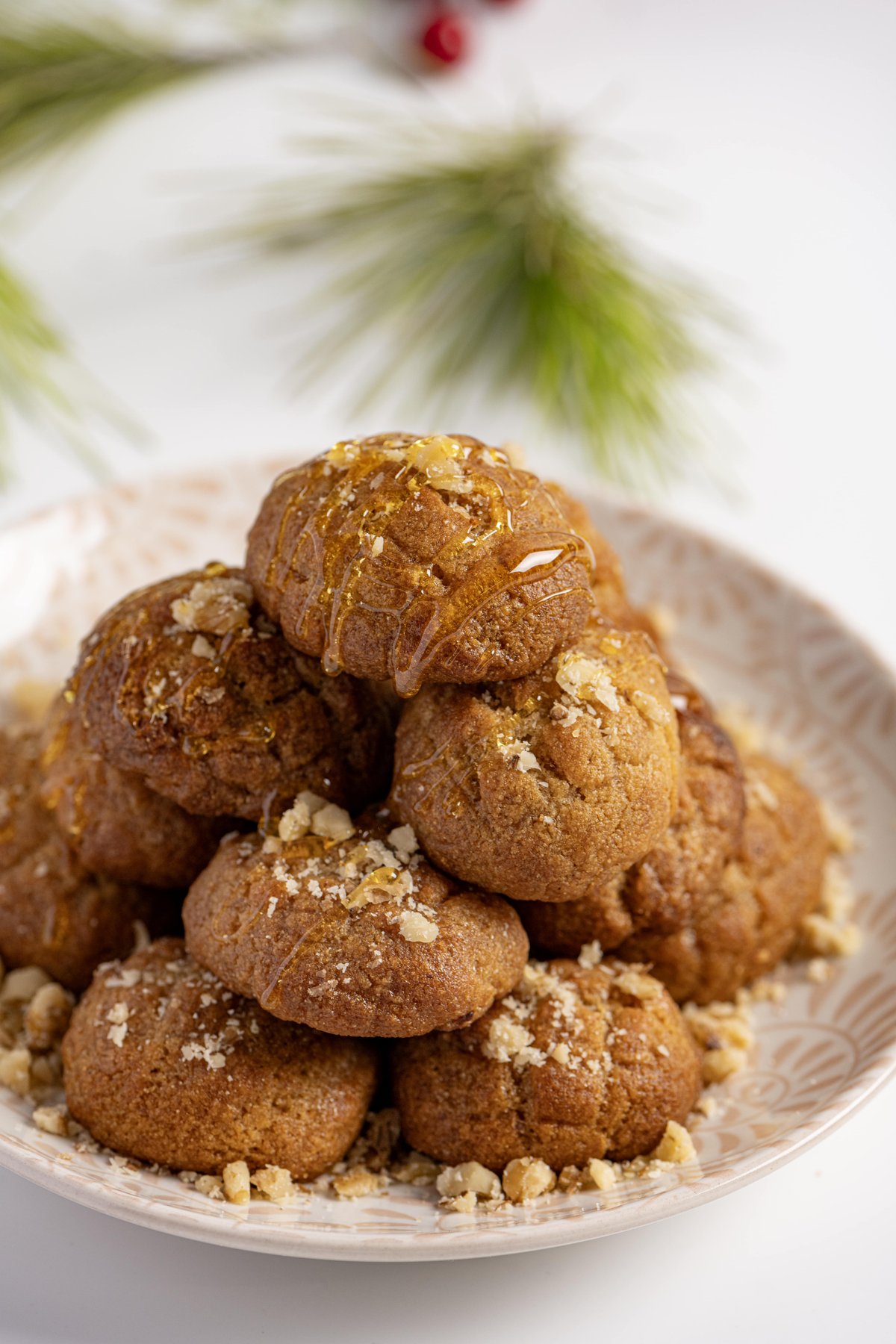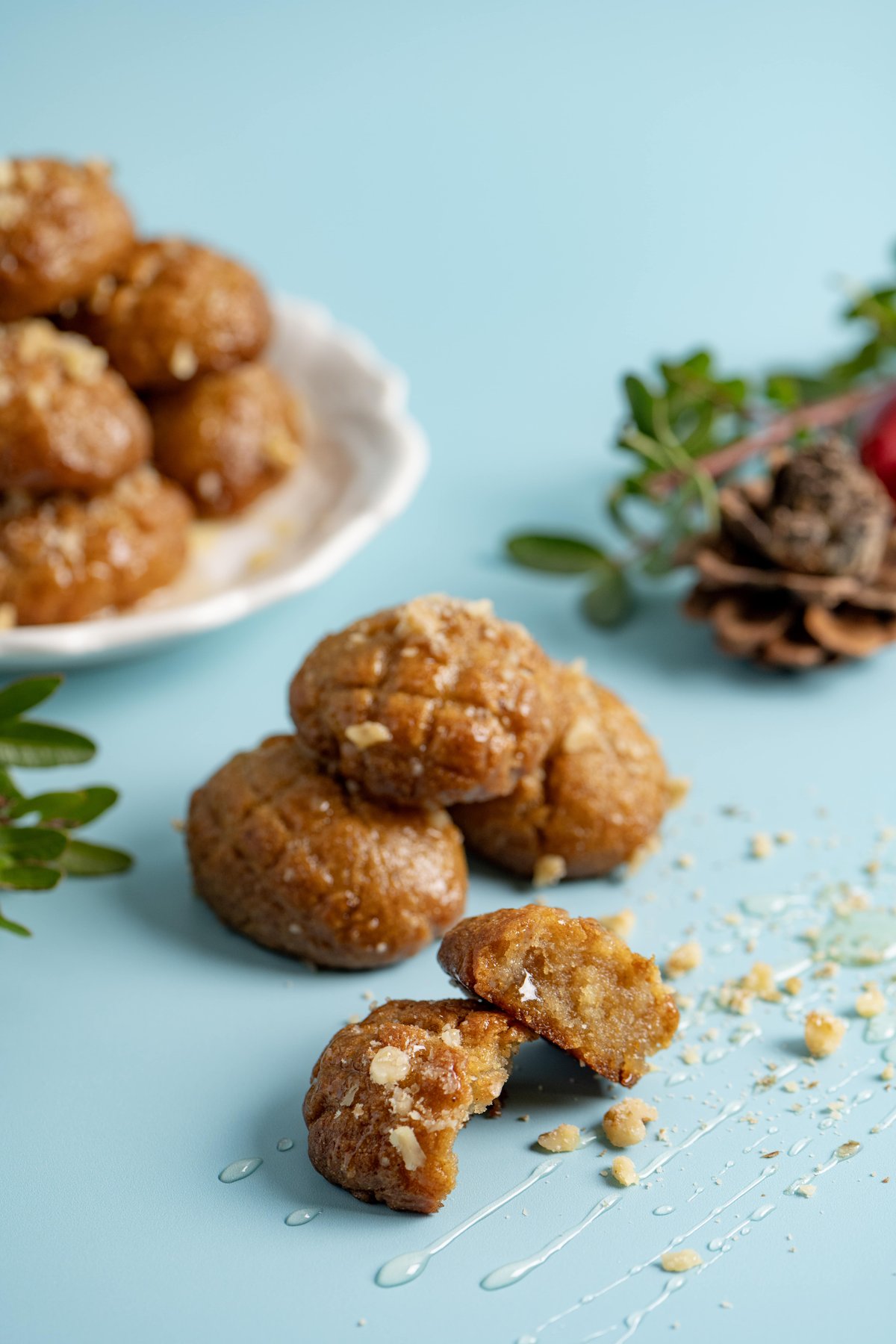 Χειροποίητα μελομακάρονα, πλασμένα ένα ένα στο χέρι , με παρθένο ελληνικό ελαιόλαδο, ελληνικό μέλι, καρύδια και αλεύρι από ρύζι, φακή, άμυλο πατάτας και καλαμποκιού.