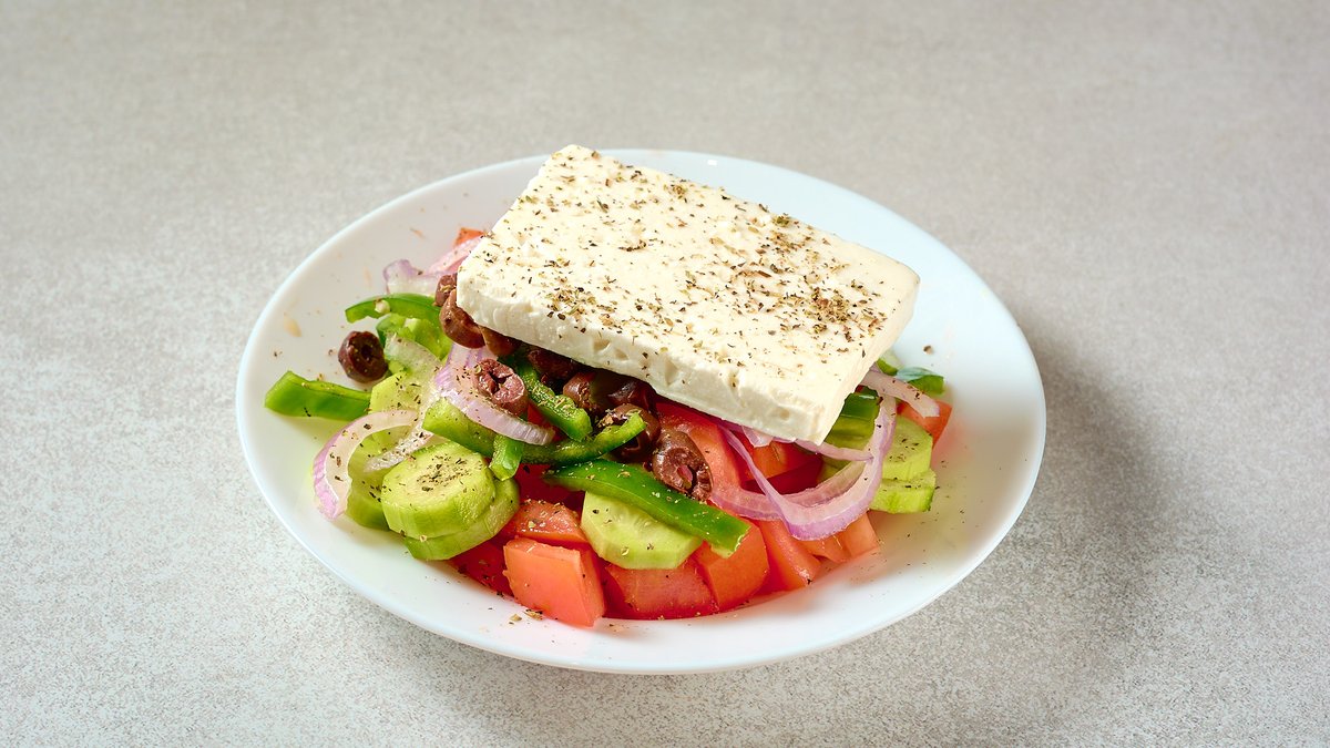 Σαλάτα με ντομάτα, αγγούρι, κρεμμύδι, ελιές, πιπεριά, φέτα, ελαιόλαδο και ρίγανη