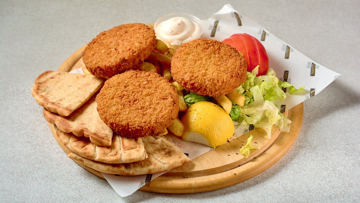 3 Τεμάχια. Συνοδεύεται από πατάτες τηγανητές, ντομάτα, μαρούλι, μαγιονέζα νηστίσιμη και 1 πίτα