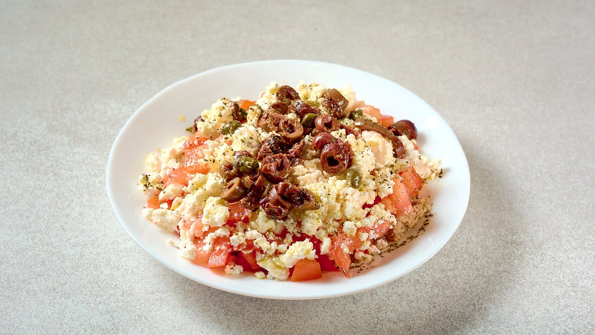 Σαλάτα με παξιμάδι κριθαρένιο, ντομάτα , φέτα, ελιά, ελαιόλαδο και κάππαρη