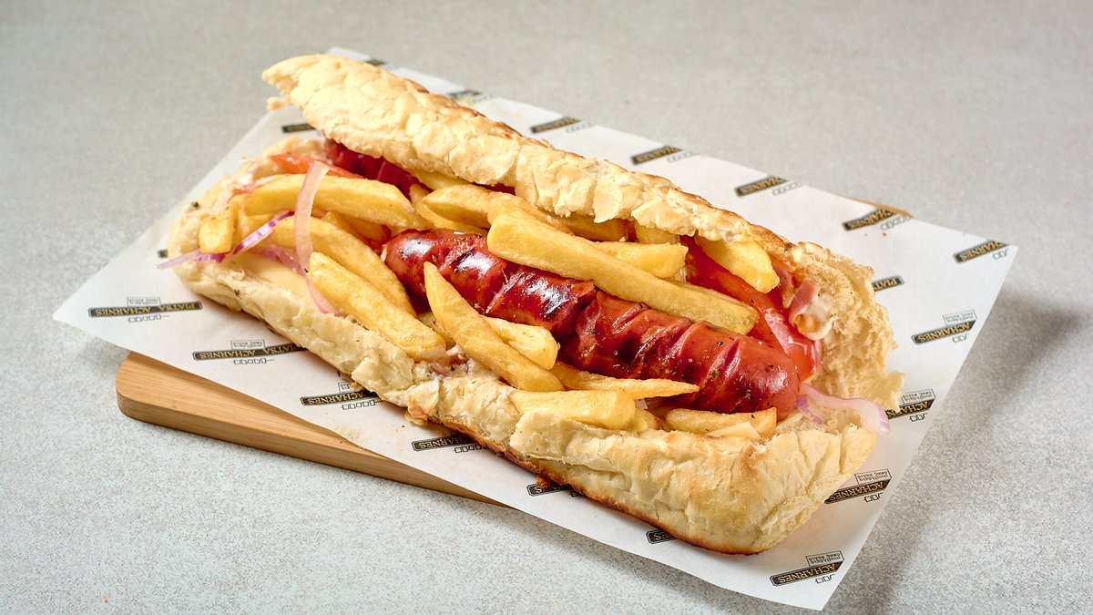 Σάντουιτς 1 τεμάχιο λουκάνικο χωριάτικο Μυκόνου με τα υλικά της επιλογής σου