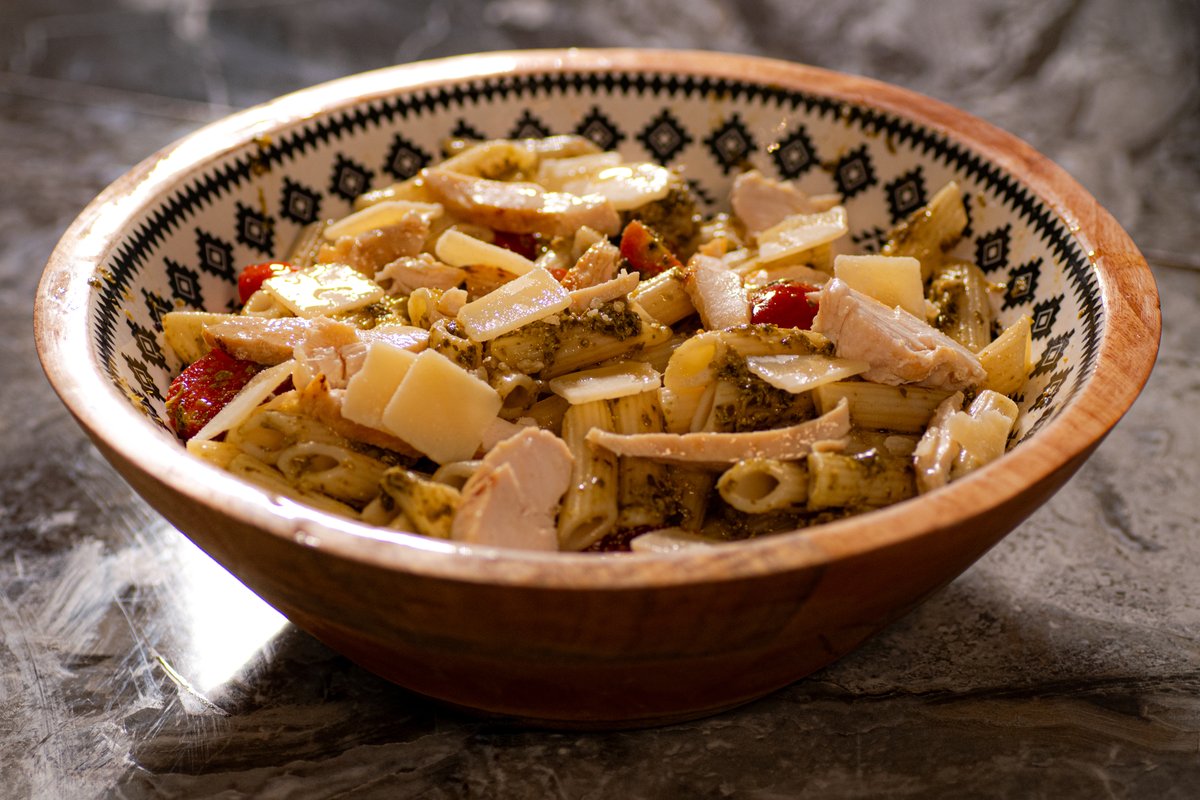 Με πένες, κοτόπουλο, ντοματίνια και pesto sauce