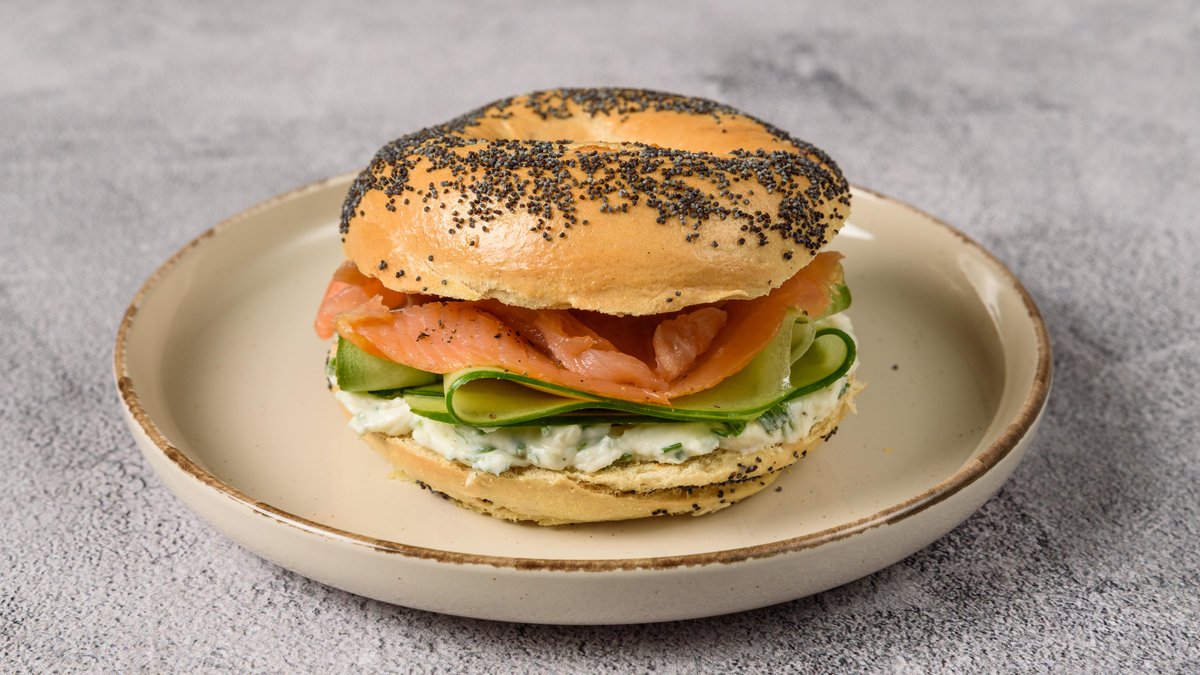 Bagel με παπαρουνόσπορο, με σολομό, αγγουράκι και τυρί Philadelphia με σχοινόπρασο και άνηθο