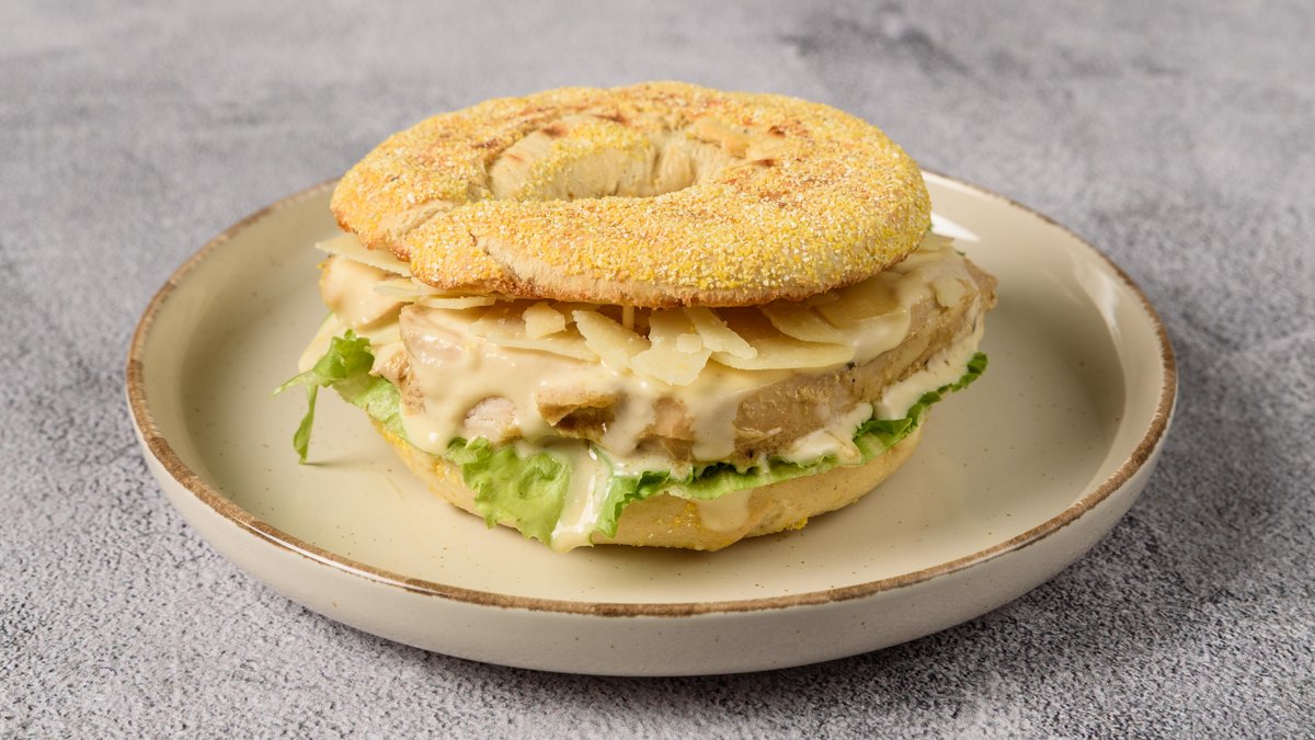 Bagel φτιαγμένο από καλαμπόκι, iceberg, παρμεζάνα, κοτόπουλο και Caesar sauce